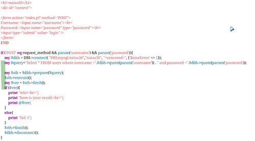 Este es relativamente sencillo, una vez encuentras la información adecuada. En cuanto vi el source code, vi que se trataba de una SQL injection. Pero probando los típicos no lograba nada. Como el lenguaje es Perl, busqué específicamente, ya que es muy parecido al código de la página.